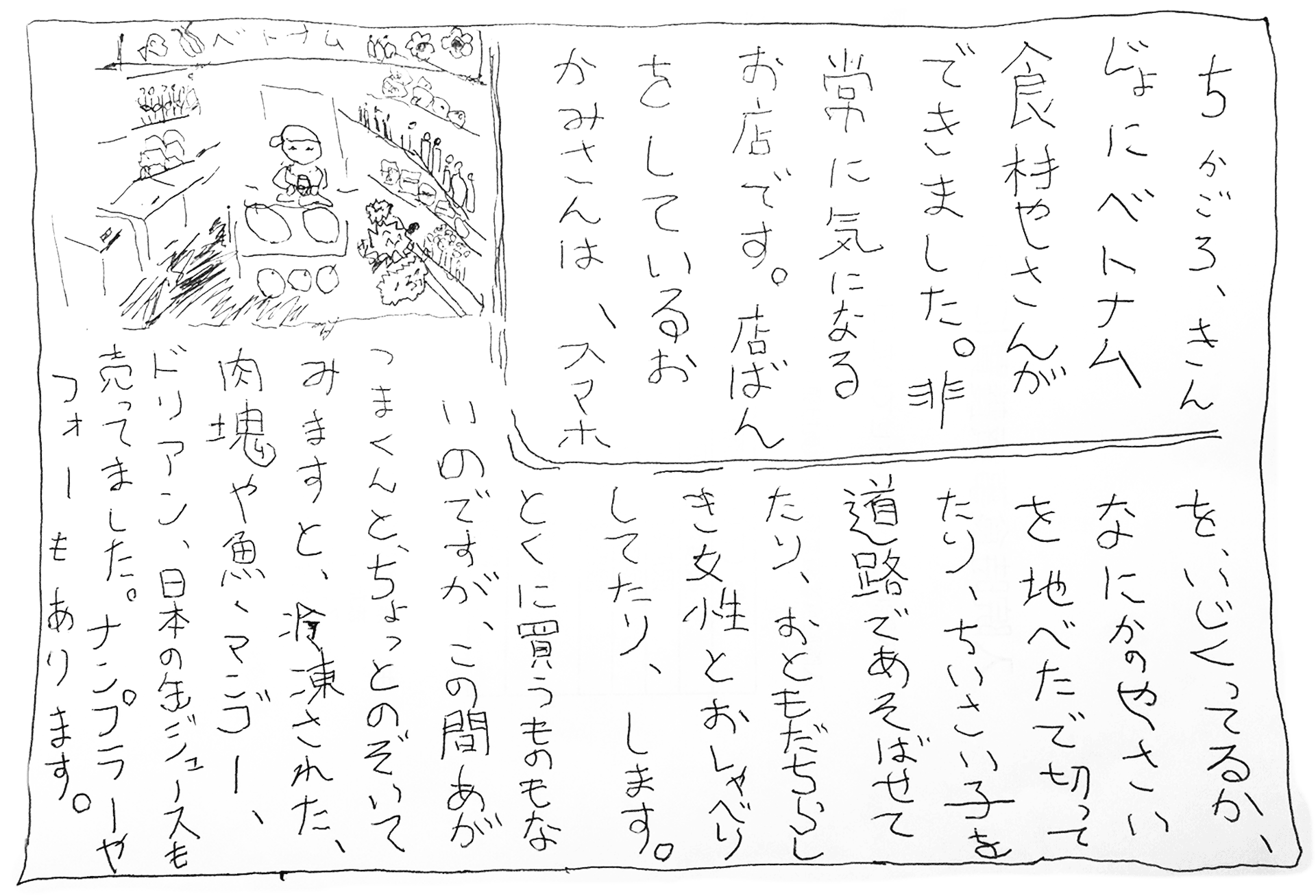 ちかごろ、きんじょにベトナム食材やさんができました。非常に気になるお店です。店ばんをしているおかみさんは、スマホをいじくってるかなにかのやさいを地べたで切ってたり、ちいさい子を道路であそばせてたり、おともだちらしき女性とおしゃべりしてたり、します。とくに買うものもないのですが、この間あがつまくんと、ちょっとのぞいてみますと、冷凍された肉塊や魚、マンゴー、ドリアン、日本の缶ジュースも売ってました。ナンプラーやフォーもあります。